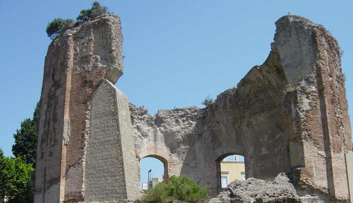 PARCO ARCHEOLOGICO DI BAIA Le "Terme di Baia" si estendono su tutto il versante della collina di Baia e sono organizzate su una serie di terrazzamenti, ognuno dei quali occupati da residenze concepite come organismi architettonici indipendenti, collegati tra loro tramite rampe a gradoni. La prima di queste residenze è nota con il nome "Villa dell'Ambulatio" e comprende ambienti, dalla diversa destinazione, prospicienti sei terrazze. L'intero complesso aveva pavimenti in marmo e in mosaico bianco e nero. La parte centrale del complesso delle terme è occupato da un nucleo detto della "Sosandra" questo si articola su quattro terrazzamenti e si caratterizza per la presenza di stucchi e raffinati pavimenti in mosaico. Dal più grande degli ambienti che conformano questo complesso proviene la statua in marmo di Aspasia nota anche come Afrodite Sosandra (copia romana di statua originale greca). Altri edifici termali completano il complesso, tra questi quello noto come il "Tempio di Mercurio" caratterizzato da una piscina termale a pianta circolare con volta a cupola, non del tutto conosciuto perchè parzialmente interrato e sommerso, nel quale fu ritrovata la testa in marmo di Apollo (copia di originale greca in bronzo).
